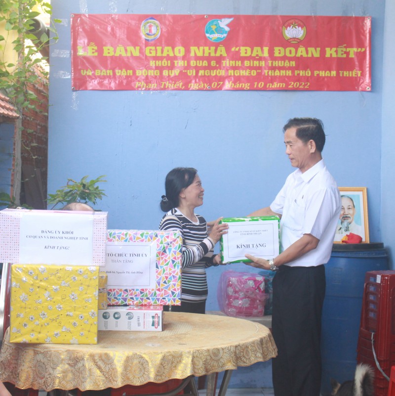 Đến tham dự buổi lễ bàn giao nhà có các đồng chí đại diện lãnh đạo các đơn vị Khối Thi đua 6: Đảng ủy Khối cơ quan và doanh nghiệp tỉnh, Văn phòng Tỉnh ủy, Cơ quan Ủy ban Kiểm tra Tỉnh ủy, Ban Tổ chức Tỉnh ủy, Báo Bình Thuận, Trường Chính trị tỉnh, Ban Nội chính Tỉnh ủy, Ban Dân vận Tỉnh ủy, Ban Tuyên giáo Tỉnh ủy; Đại diện lãnh đạo UBMTQ thành phố Phan Thiết, Hội Liên hiệp Phụ nữ thành phố Phan Thiết, UBND Phường Đức Long và Đại diện Công ty TNHH MTV Xổ số kiến thiết Bình Thuận.
